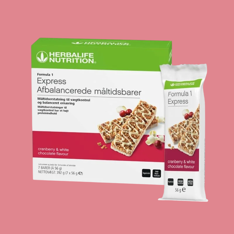 Formula 1 Express Bar White Chocolate & Cranberry – balansert måltidsbar med protein, fiber, vitaminer og mineraler. Praktisk, smakfull og næringsrik.