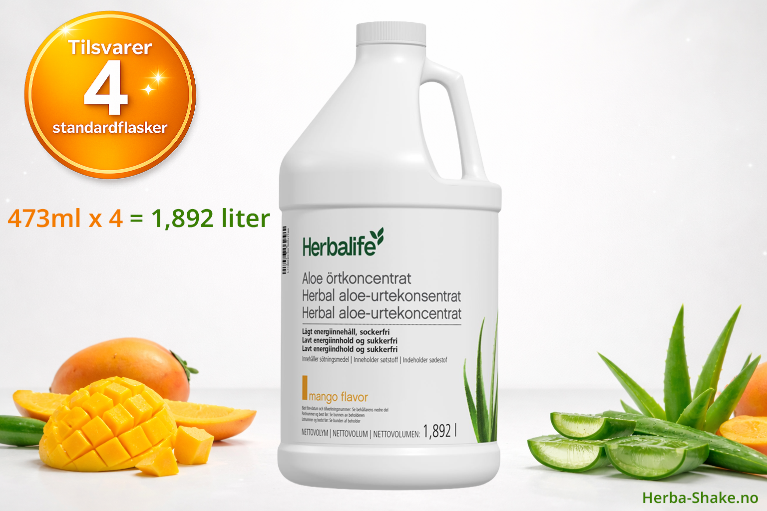 Herbal Aloe Mango stor flaske på 1,892 liter med 40 % aloe vera. Sukkerfri og kalorifattig drikk med frisk mangosmak som tilsvarer hele 4 flasker. Perfekt for daglig hydrering.