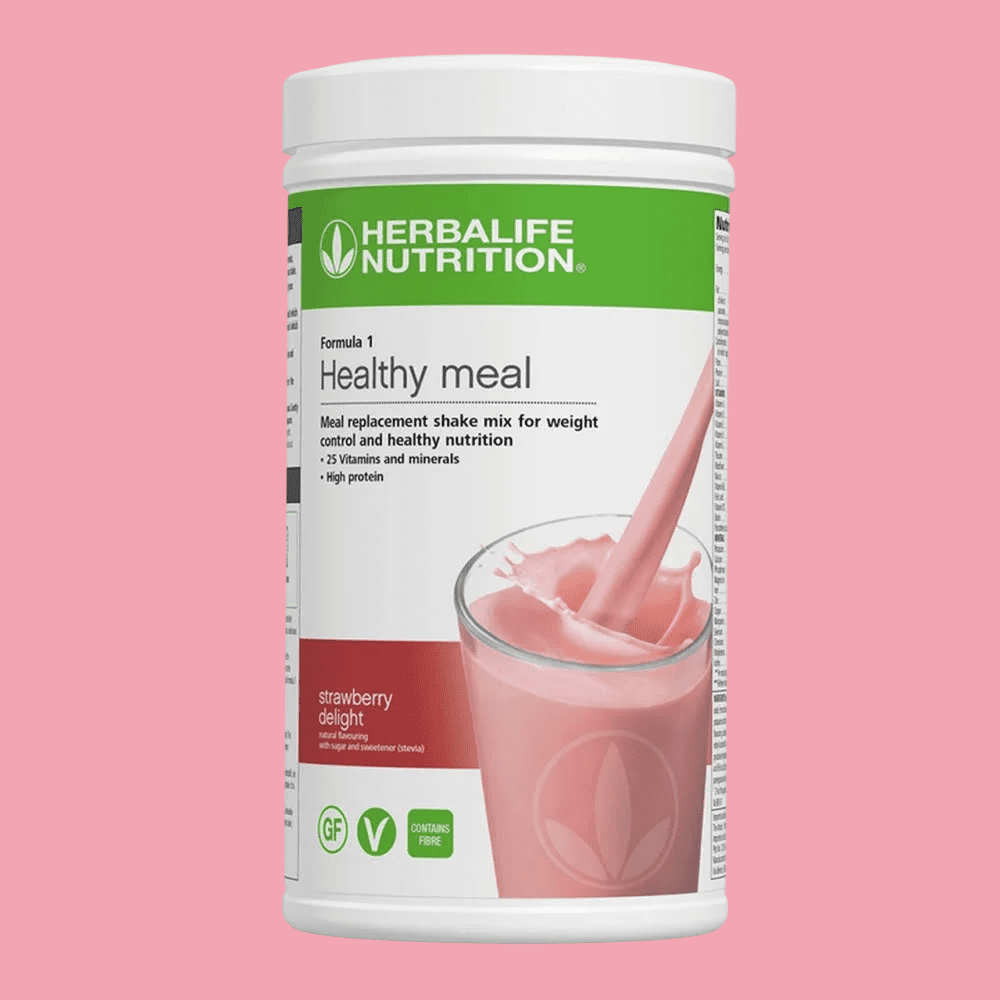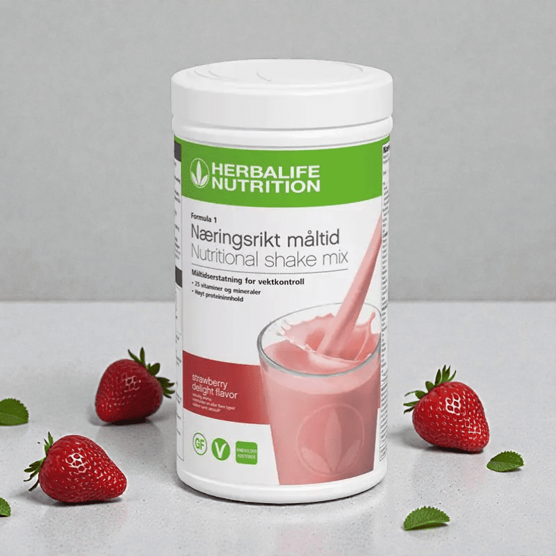 Herbalife Formula 1 Strawberry Delight er en komplett måltidserstatning rik på protein, fiber, 25 vitaminer og mineraler. Laget med plantebaserte ingredienser og helt glutenfri – et perfekt valg for en sunn livsstil, vekttap eller vektkontroll.