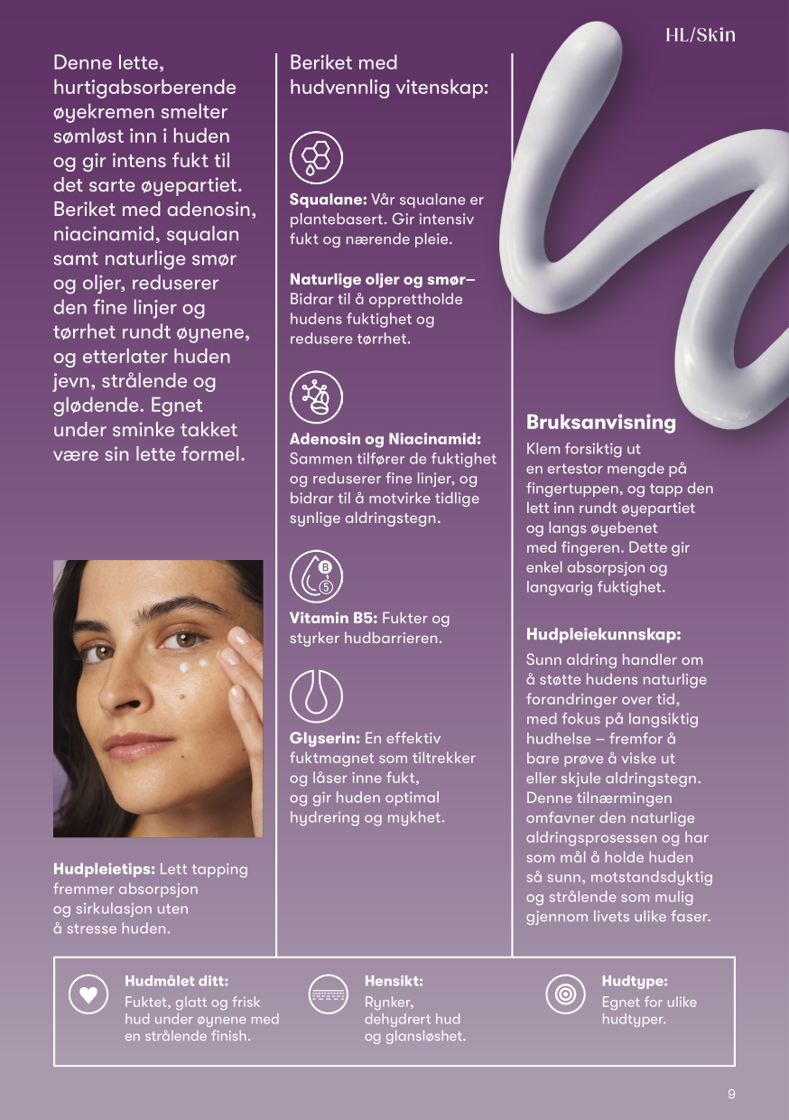 HL/Skin Nourishing Eye Cream 15 ml gir intensiv fukt, reduserer fine linjer og rynker og trekker raskt inn uten å føles fet. Perfekt under sminke.