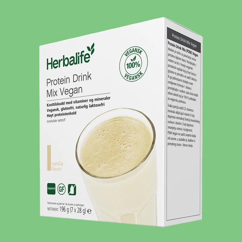 Protein Drink Mix Vegan – 7 porsjonsposer gir deg protein, 22 vitaminer og mineraler i en praktisk, 100 % vegansk formel. Perfekt alene eller med Formula 1 Shake.