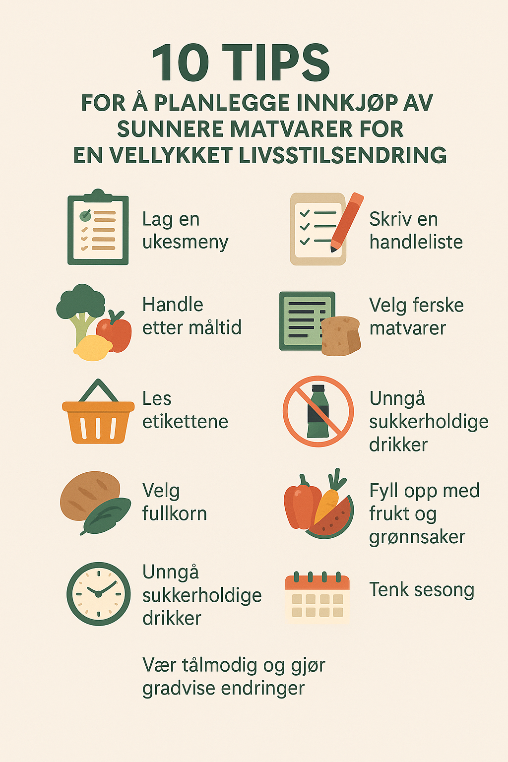 Å oppnå en sunnere livsstil starter ofte med smartere valg i matbutikken. Planlegging av innkjøp av sunnere matvarer er en av de viktigste nøklene til suksess. Her får du 10 praktiske tips som hjelper deg med å planlegge bedre innkjøp og støtte en vellykket livsstilsendring.